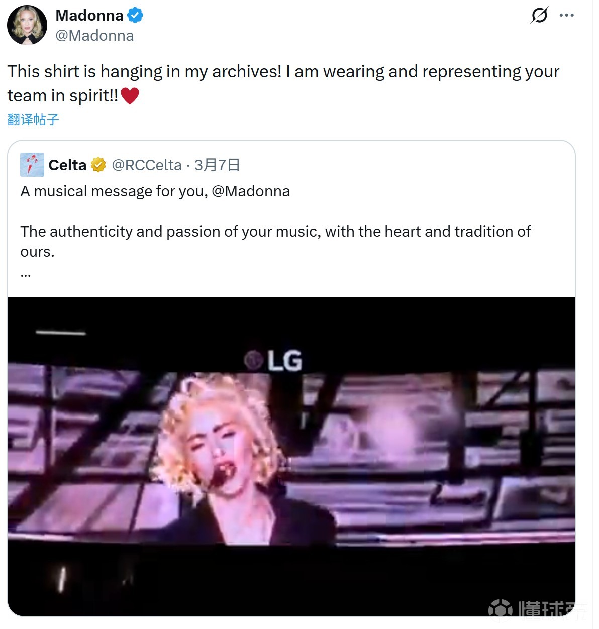 值得一提的是,在球队近期主场对阵皇家马德里的比赛前,塞尔塔还特意在球场举行了一场致敬表演。巴莱多斯球场草坪上,一支女子合唱团在弦乐团伴奏下演唱了麦当娜1989年的经典歌曲Like a Prayer,以此向这位流行乐天后致敬。