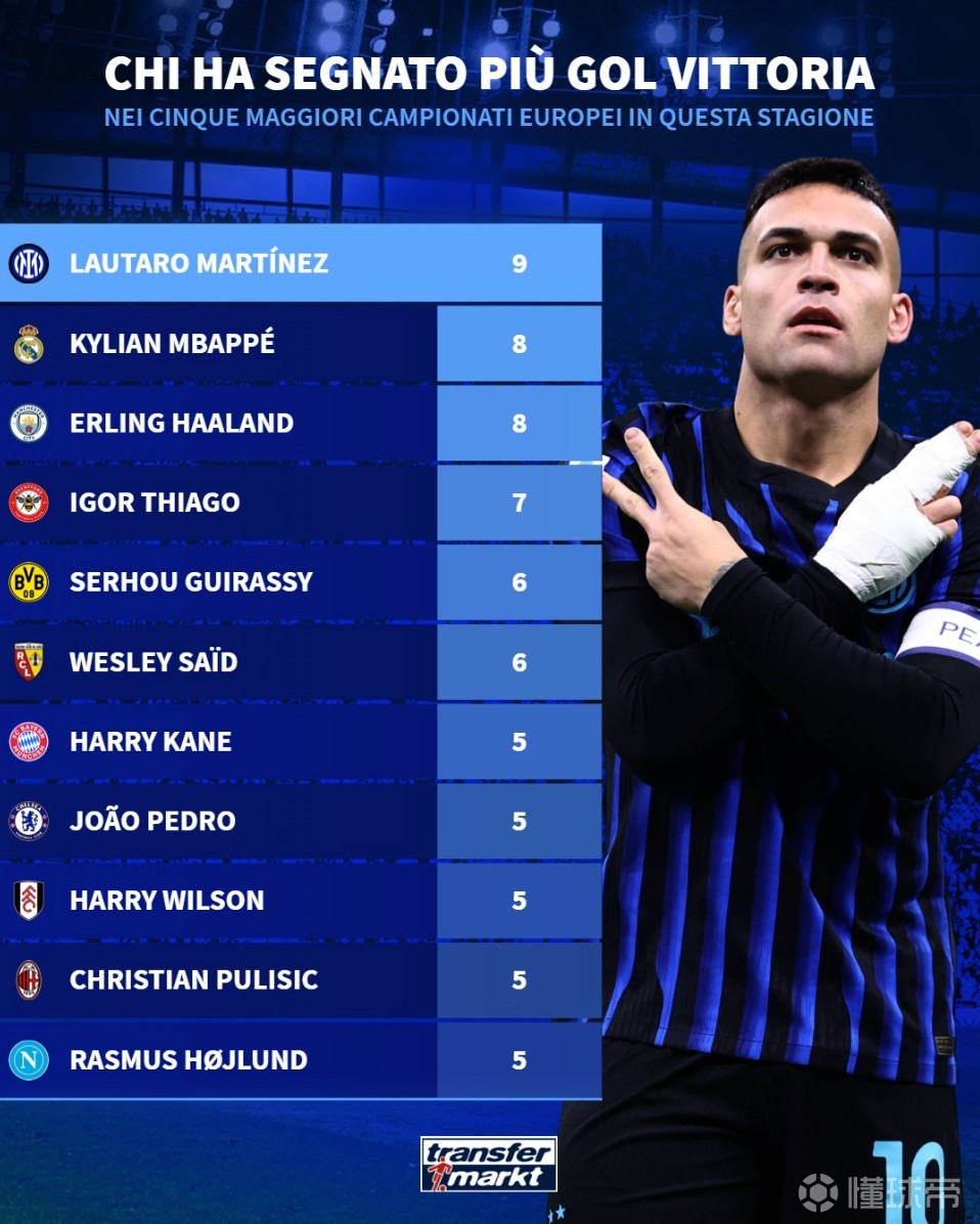 北京时间3月6日,德转统计出了本赛季欧洲五大联赛球员制胜球进球榜,劳塔罗9球第一,姆巴佩、哈兰德8球并列第二。