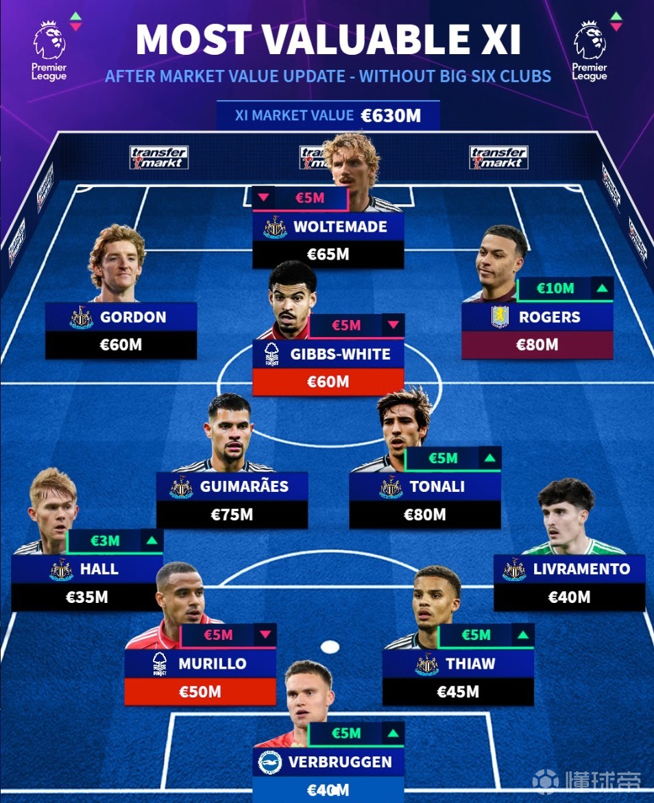 托纳利(纽卡斯尔联)8000万欧元(+500万欧元)、吉马良斯(纽卡斯尔联)7500万欧元、吉布斯-怀特(诺丁汉森林)6000万欧元(-500万欧元)