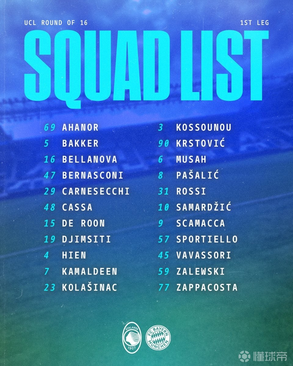 北京时间3月10日,亚特兰大公布了欧冠1/8决赛他们主场迎战拜仁慕尼黑的大名单,拉斯帕多里、德凯特拉雷、埃德松-席尔瓦以及斯卡尔维尼因伤缺阵。