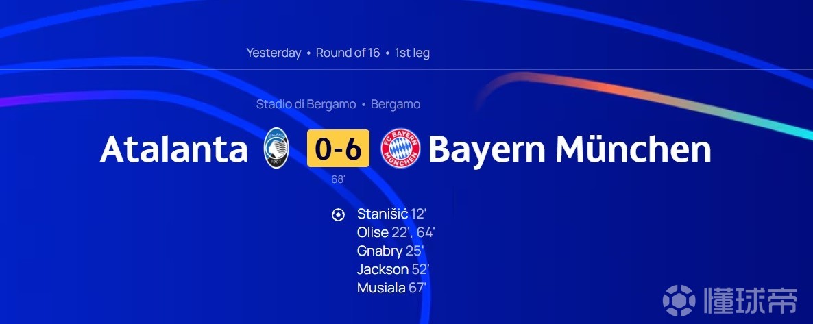 北京时间3月11日,在欧冠1/8决赛首回合的比赛中,亚特兰大在开场67分钟过后就被拜仁慕尼黑打进6球,全场比赛1-6不敌拜仁。
