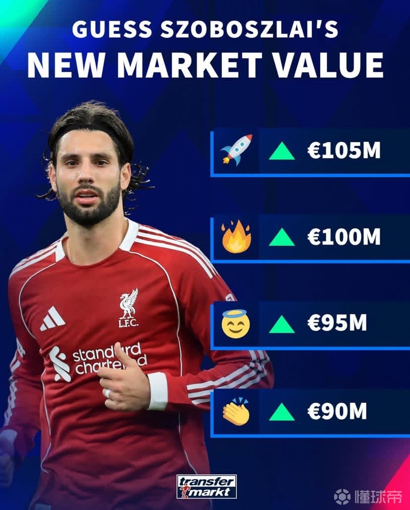在德转给出的4个选项中,索博斯洛伊身价最高涨至1.05亿欧元,其次是涨至1亿欧元、9500万欧元以及9000万欧元。