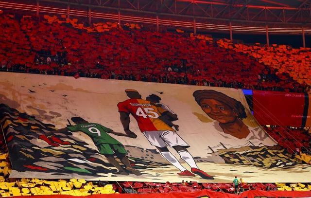 比赛还没开踢,加拉塔萨雷的看台上就缓缓展开了一幅巨大的看台海报(Tifo)。画面里不仅画着奥斯梅恩,还有他早逝的母亲,两人都穿着球衣。海报下方还配了一句极其戳心的话:“我们是一家人,家人就是一切。”