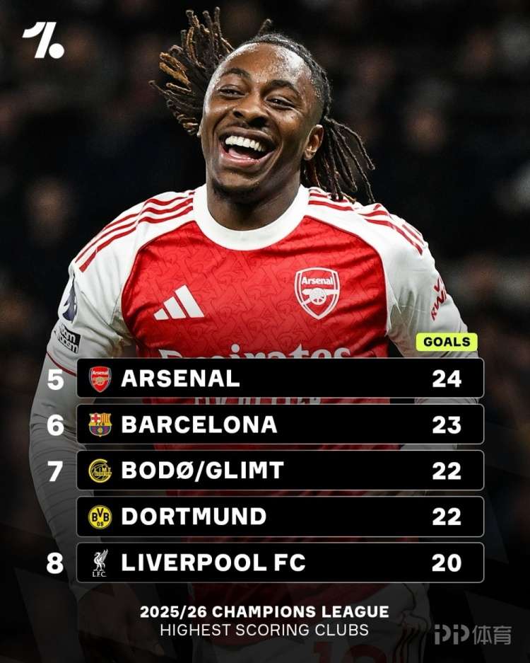 Onefootball统计了各队本赛季欧冠的进球数量,并列出榜单,巴黎31球居首,马竞29球次席。