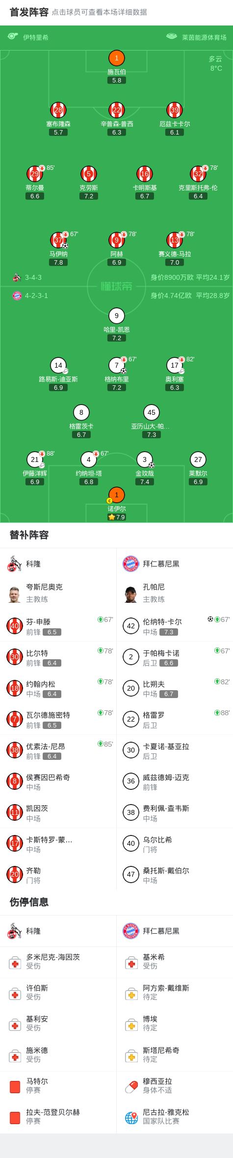 北京时间1月15日,德国足球甲级联赛第17轮展开较量,科隆坐镇主场迎战拜仁慕尼黑。上半场,格纳布里失误被断后马伊纳远射破门,奥利塞助攻格纳布里小角度破门扳平;下半场,伊藤洋辉助攻金玟哉头球入网完成反超,迪亚斯助攻卡尔低射破门。最终全场比赛结束,科隆以1比3不敌拜仁慕尼黑。