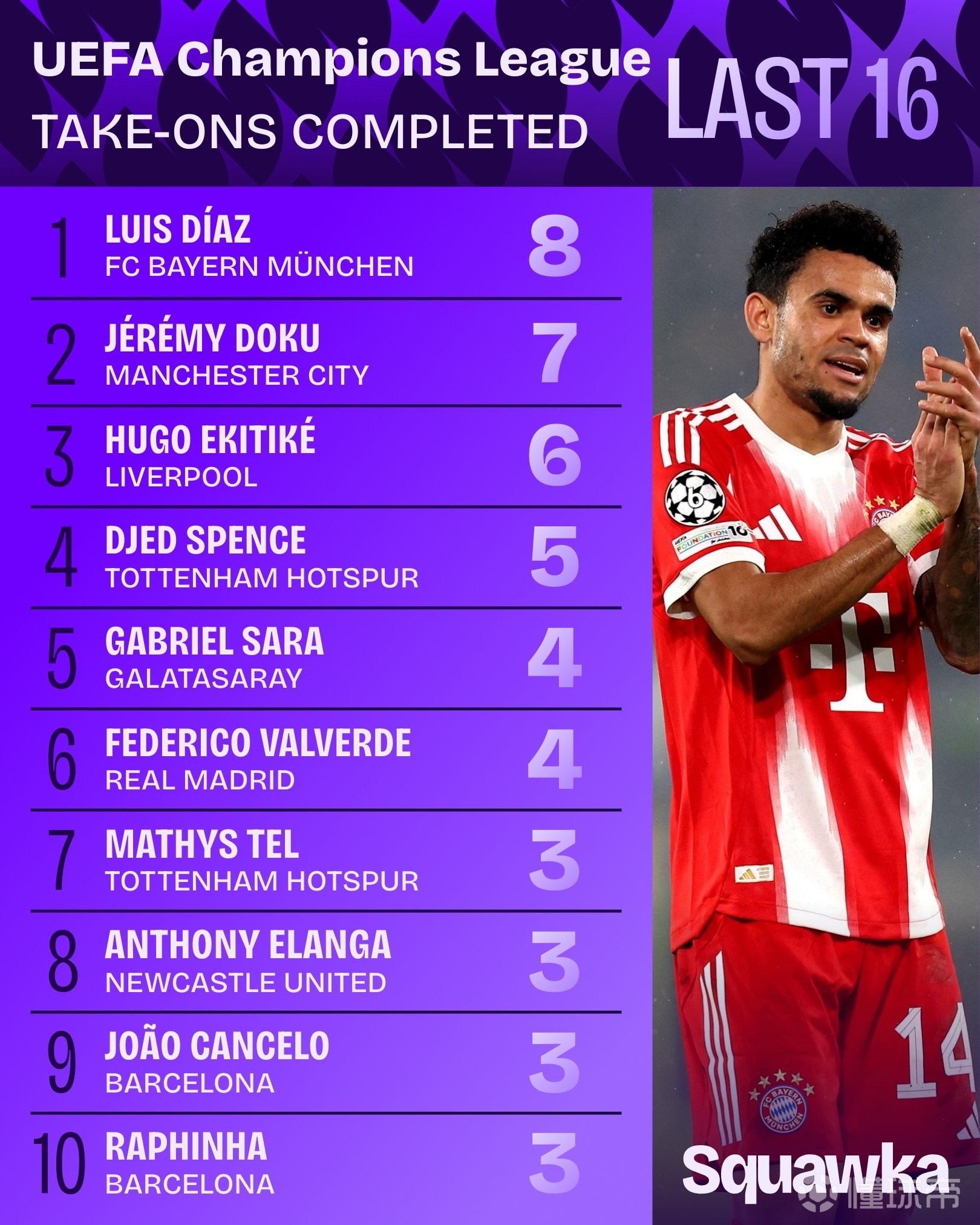 据统计,本场比赛路易斯-迪亚斯还成功过人8次,这是本赛季欧冠单场最高数据,也是他欧冠生涯的新纪录。