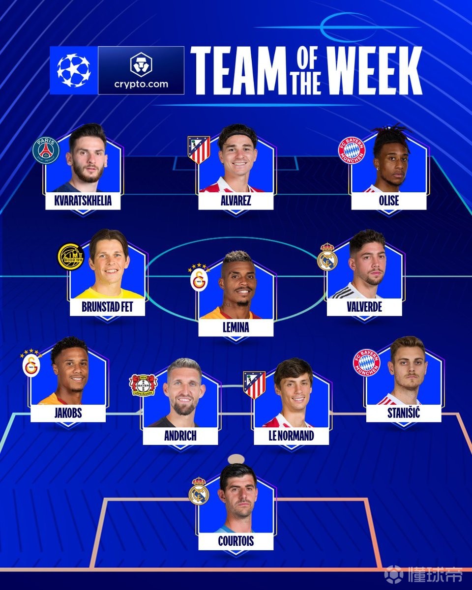 欧冠1/8决赛首回合战罢,欧冠官方公布了本周最佳阵容,巴尔韦德、奥利塞、阿尔瓦雷斯、克瓦拉茨赫利亚等人在列。