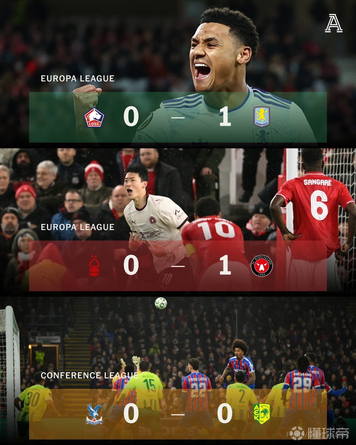 北京时间3月13日,欧联杯与欧协联比赛日已经结束。在本日的比赛中,维拉1-0战胜里尔,森林0-1不敌中日德兰,水晶宫0-0战平AEK拉纳卡,英超球队取得1胜1平1负,加上欧冠里的2平4负,本周欧战9队总成绩为1胜3平5负,仅维拉取胜。