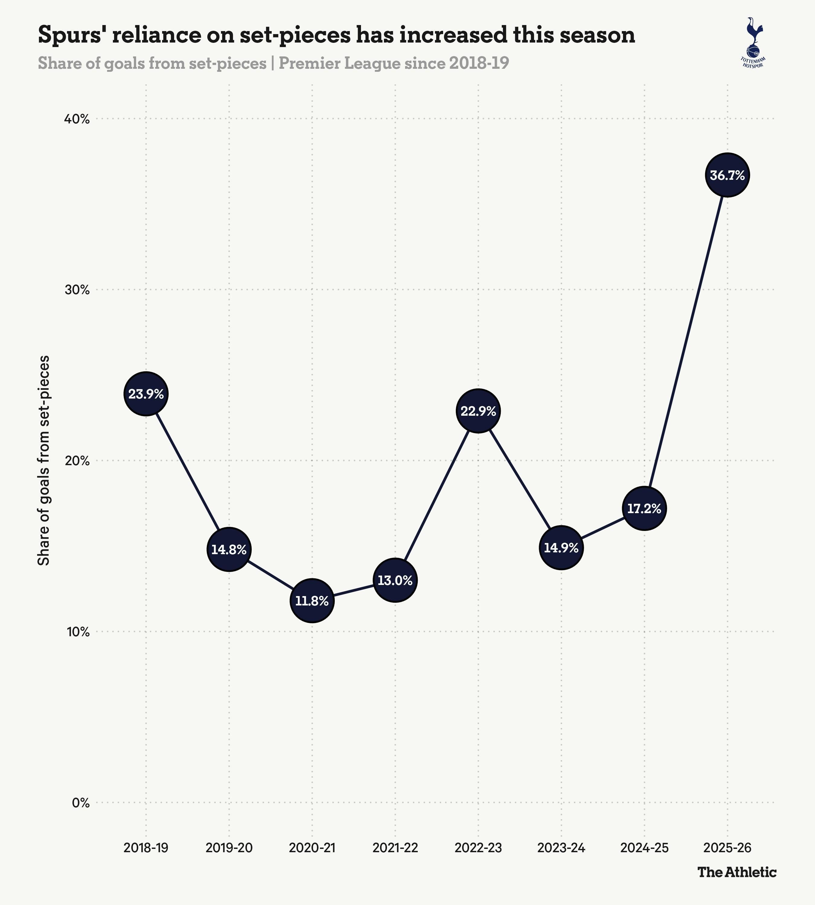 如下图所示,这是热刺八年来对定位球最为依赖的一个赛季。
