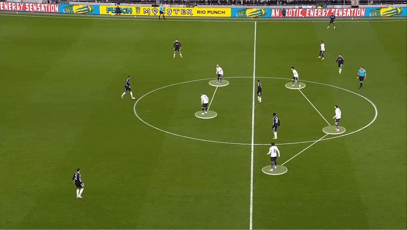 罗梅罗和范德芬经常顶出防线,由本坦库尔回撤填补空当。但当对手快速进攻时,这些轮转更难执行,热刺也因此受到了惩罚。