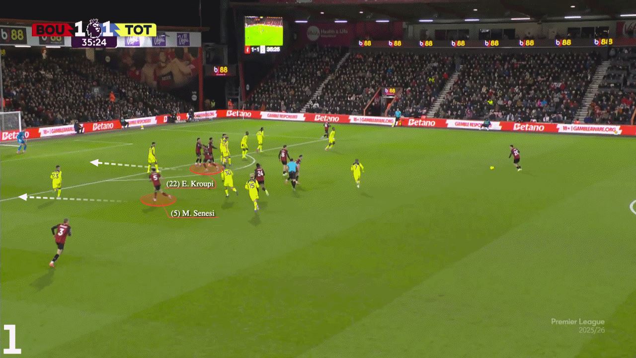 上周伊莱-朱尼奥尔-克鲁皮为伯恩茅斯的进球就是一个例子。当球发展到右路时,克鲁皮和马科斯-塞内西在无人盯防的情况下进入禁区。随后传中找到塞内西,他横敲给克鲁皮得分。