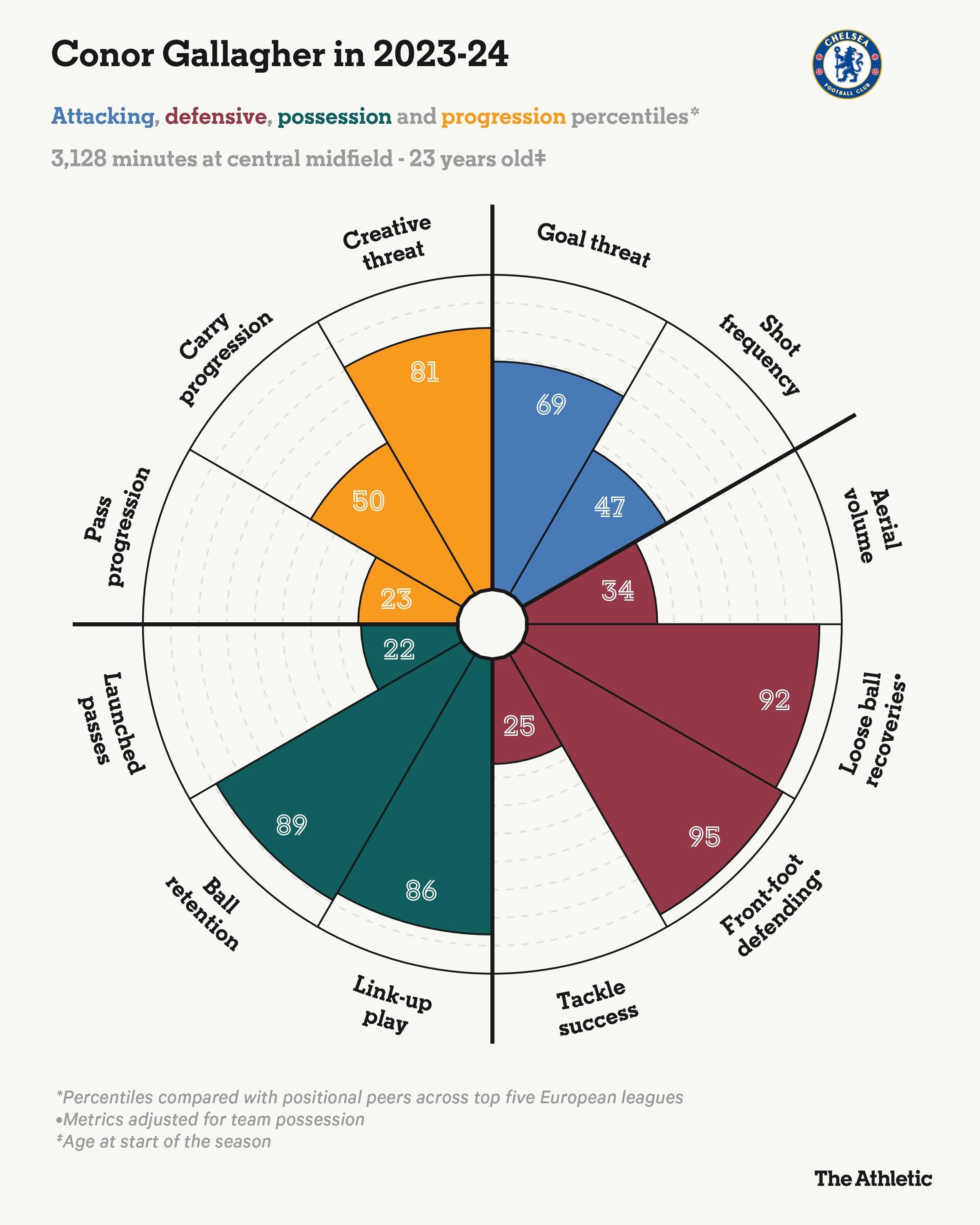 虽然他并非这支球队所需的推进性传球手,但加拉格尔在切尔西最后一个赛季的球员雷达图显示他具备有用的特质。在一个注重快速攻击和转换的球队中,他在创造力威胁、持球和衔接配合方面排名靠前,同时在37场联赛中攻入5球并助攻7次。