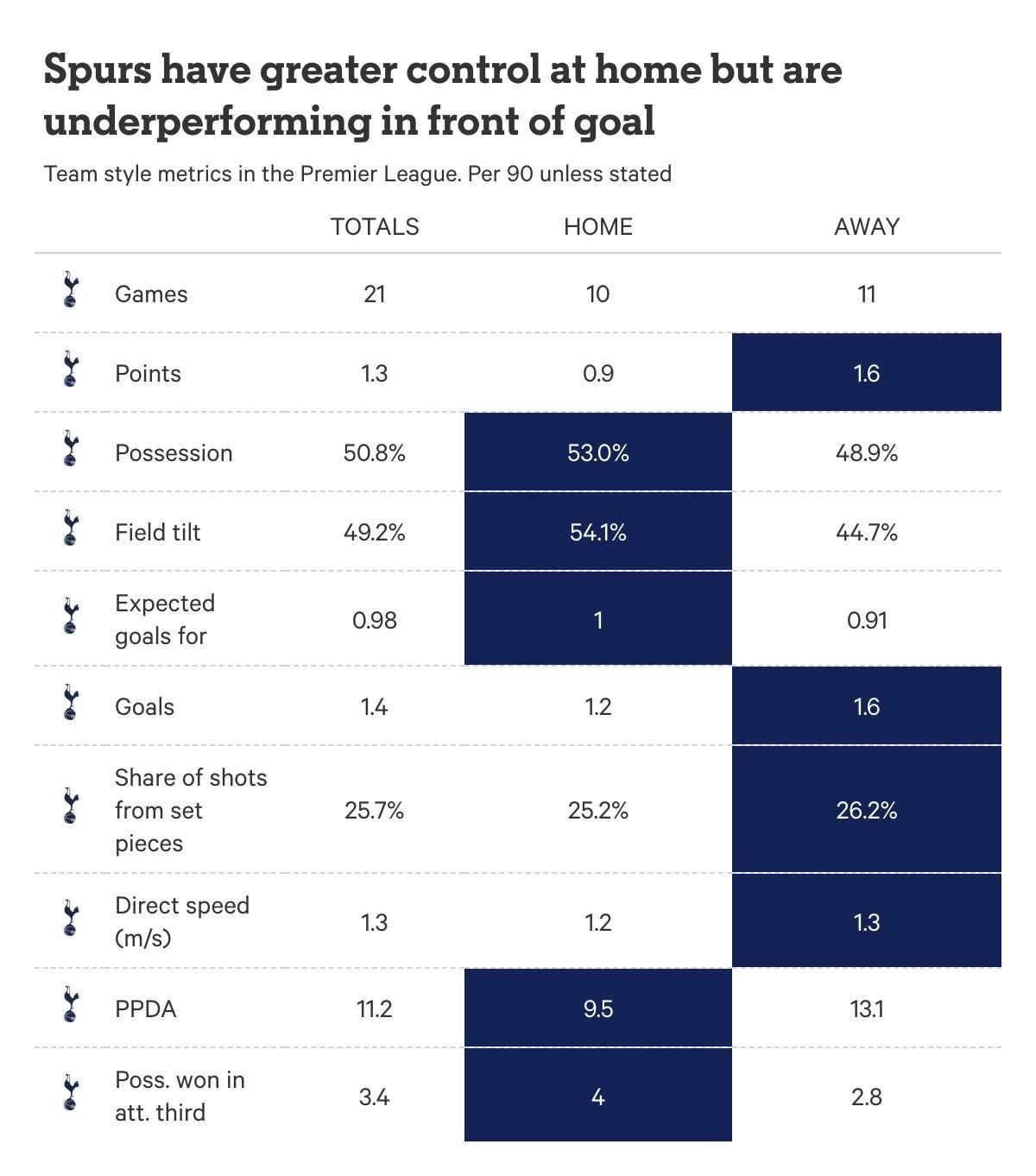 热刺在推进进攻方面的挣扎,也在其主客场表现的差异中起到了作用。