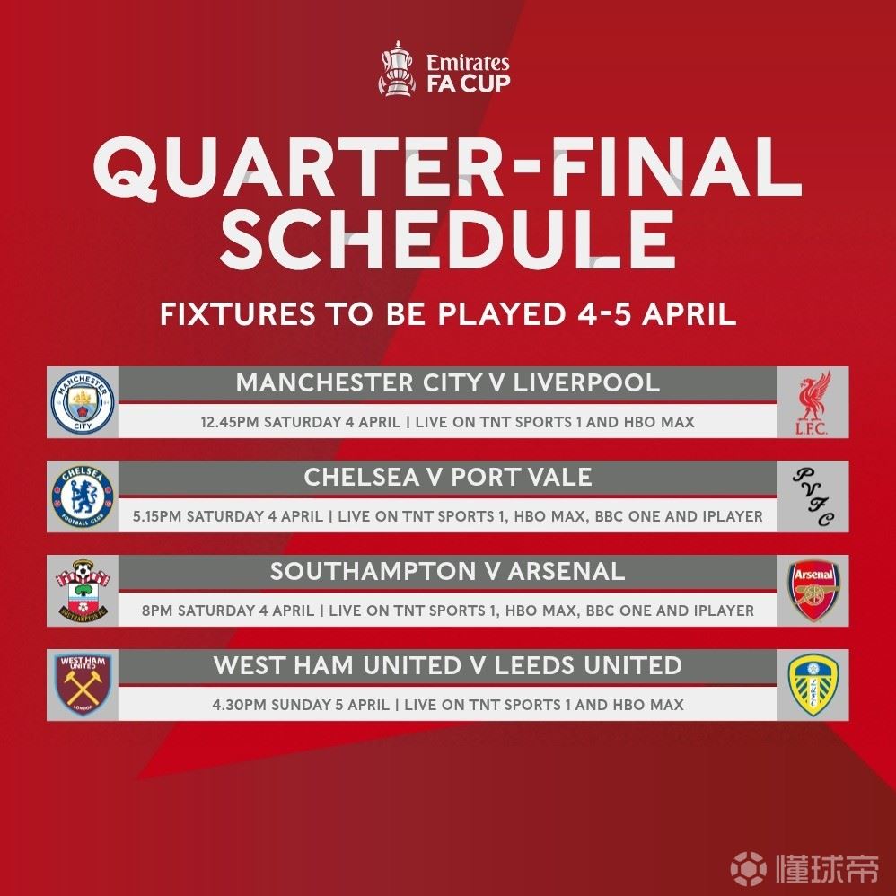 2025-26赛季足总杯1/4决赛开球时间公布,其中曼城vs利物浦的焦点战在北京时间的19点45分黄金时间开球。