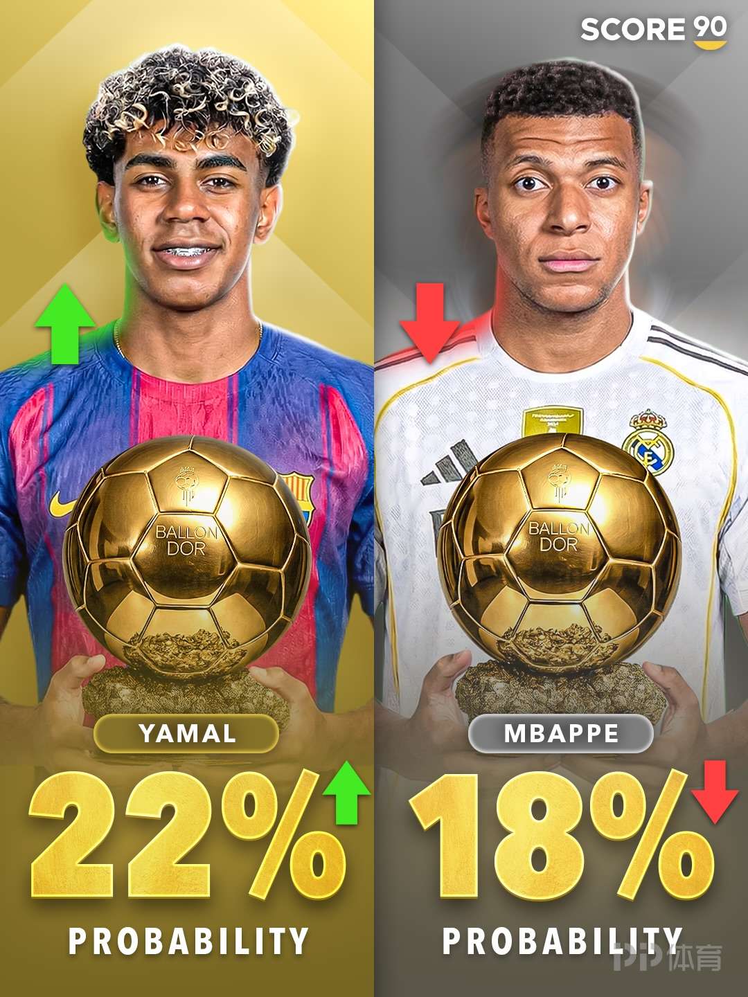 外媒score90近日根据相关机构赔率,更新了今年金球奖的获奖概率,姆巴佩的获奖概率下跌到18%,而巴萨小将亚马尔则上涨到22%。