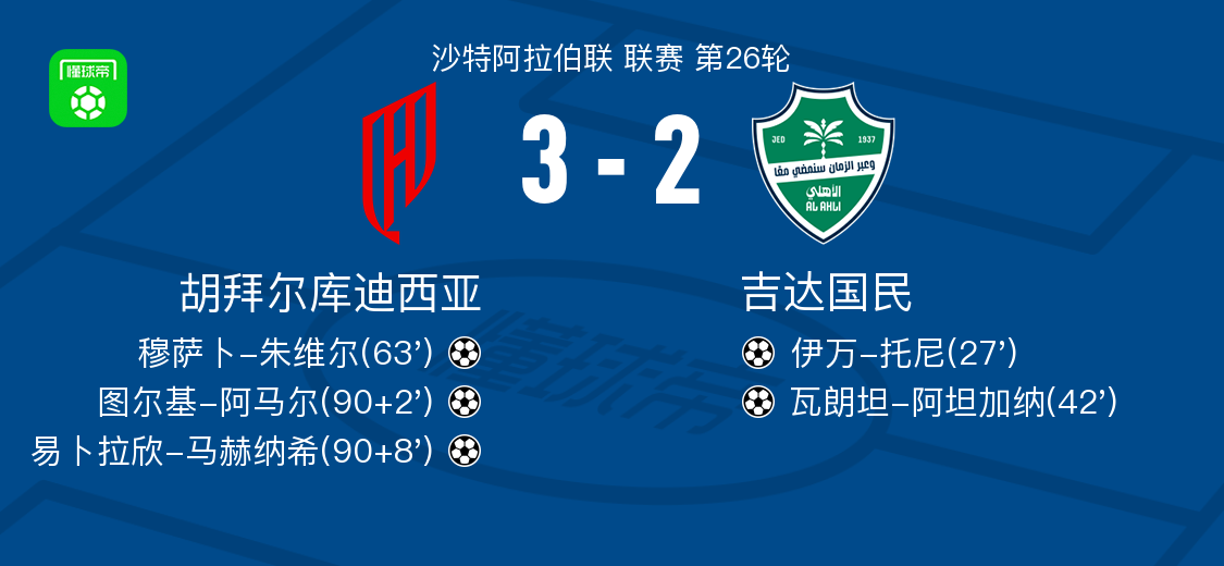 北京时间3月14日沙特阿拉伯联 联赛 第26轮,胡拜尔库迪西亚主场对阵吉达国民。胡拜尔库迪西亚穆萨卜-朱维尔破门,图尔基-阿马尔破门,易卜拉欣-马赫纳希破门。吉达国民伊万-托尼破门,瓦朗坦-阿坦加纳破门。最终比分胡拜尔库迪西亚 3-2 吉达国民。