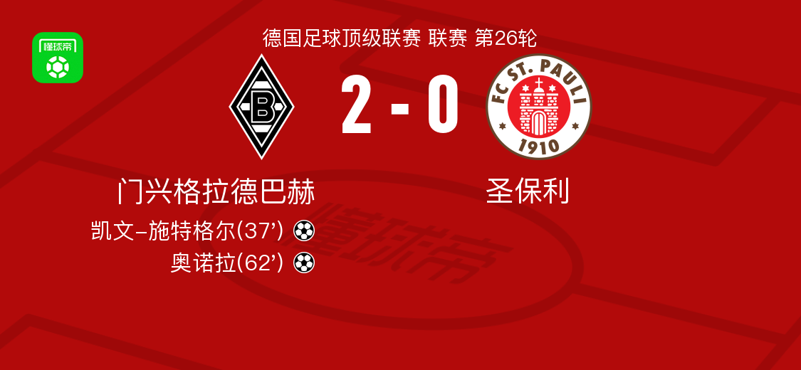 北京时间3月14日德国足球顶级联赛 联赛 第26轮,门兴格拉德巴赫主场对阵圣保利。门兴格拉德巴赫凯文-施特格尔破门,奥诺拉破门。最终比分门兴格拉德巴赫 2-0 圣保利。