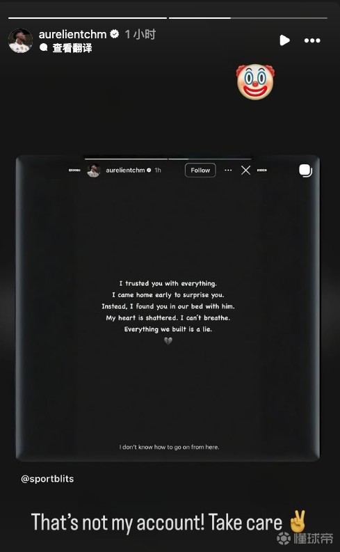 今日早些时候,有国外博主爆料楚阿梅尼发布了一条限时动态,不过目前该动态已被删除。楚阿梅尼表示:“我曾把一切都托付给你。我提前回家,本想给你一个惊喜。可结果却发现,你和他躺在我们的床上。我的心彻底碎了,连呼吸都变得困难。我们一起建立的一切,原来都是谎言。我不知道从这里开始,该怎么继续走下去。”
