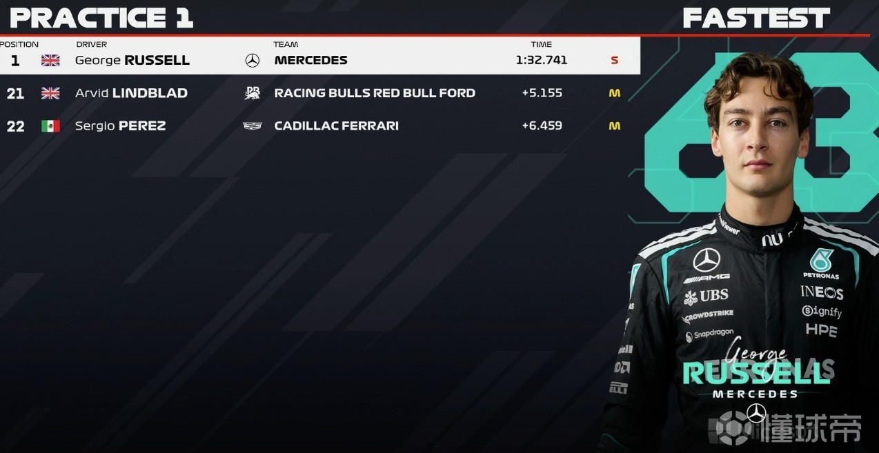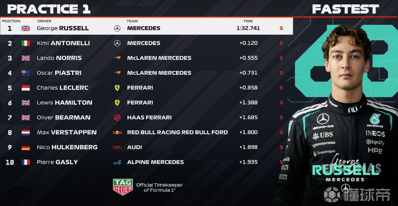 一练停表,拉塞尔全场最快,安东内利第二,诺里斯第三。