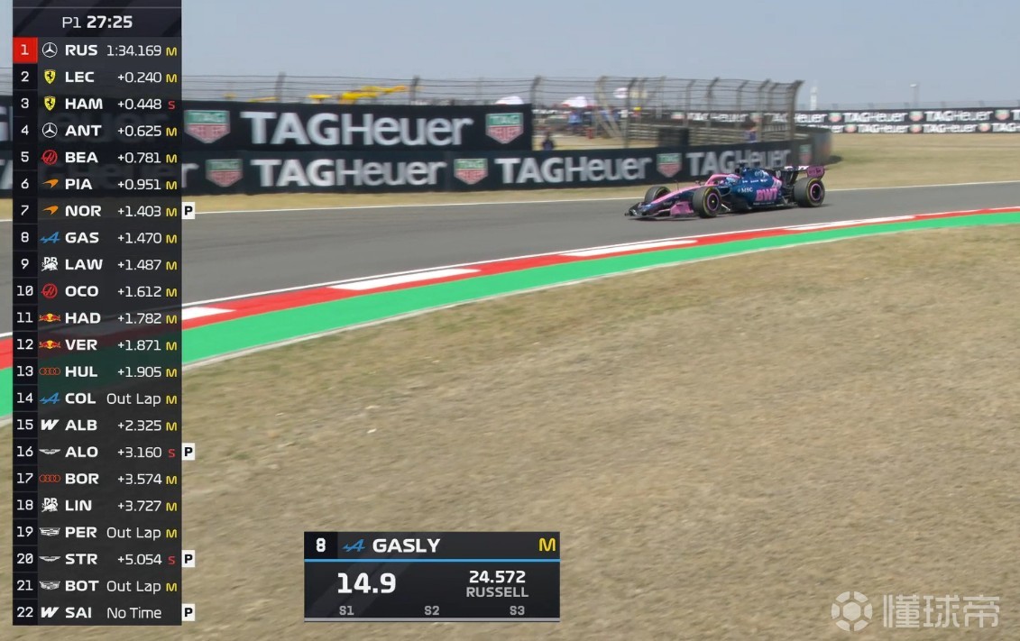 一练过半,拉塞尔排名第一,勒克莱尔第二,汉密尔顿第三。