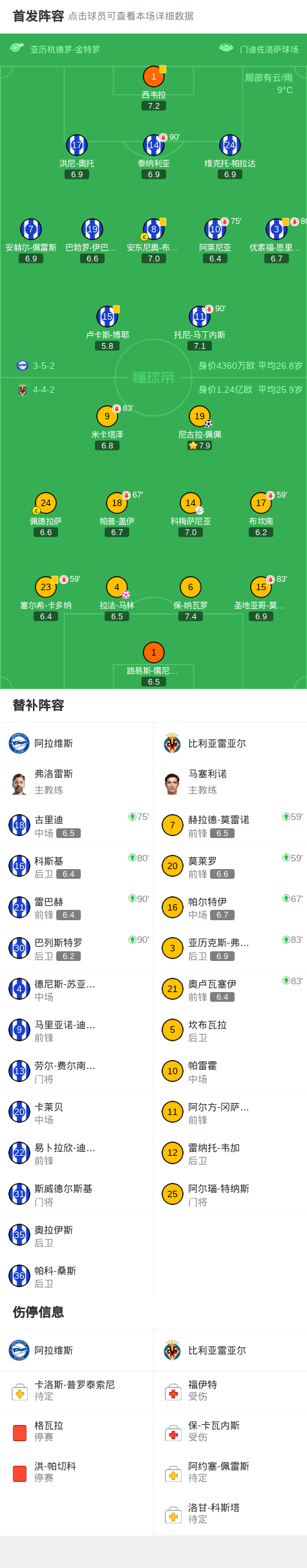 第40分钟,拉法-马林头球解围变乌龙,阿拉维斯1-0比利亚雷亚尔