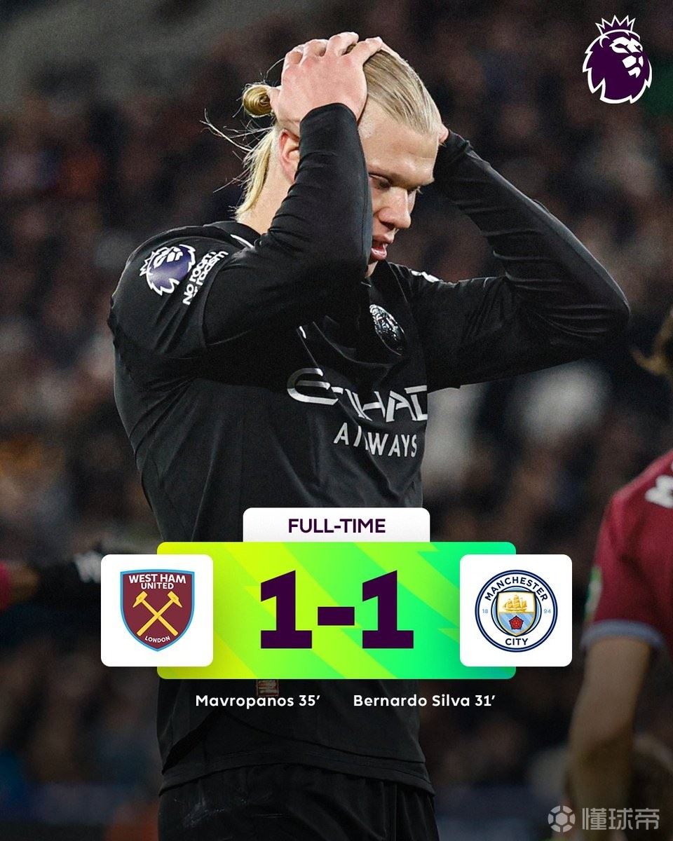 此役客场对阵西汉姆联,曼城由伯纳多-席尔瓦破门取得领先,但很快被对手扳平比分,最终1-1战平对手,在争冠路上丢掉了关键的两分。
