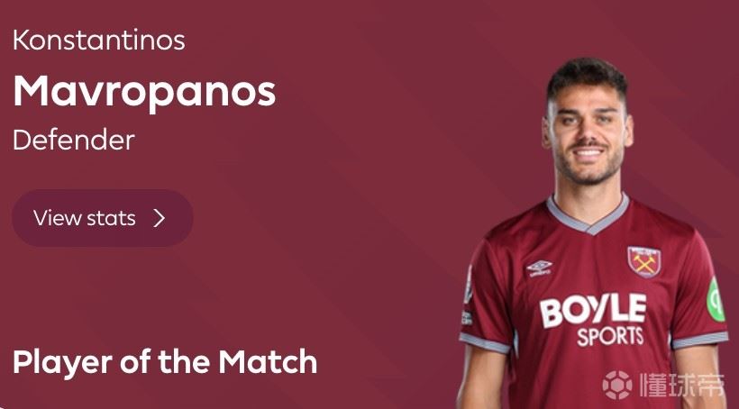 北京时间3月15日,在英超第30轮的比赛中,西汉姆联在主场1-1逼平了实力强大的曼城,赛后此战第35分钟利用角球机会头球为铁锤帮扳平场上比分的马夫罗帕诺斯当选英超官方全场最佳球员。