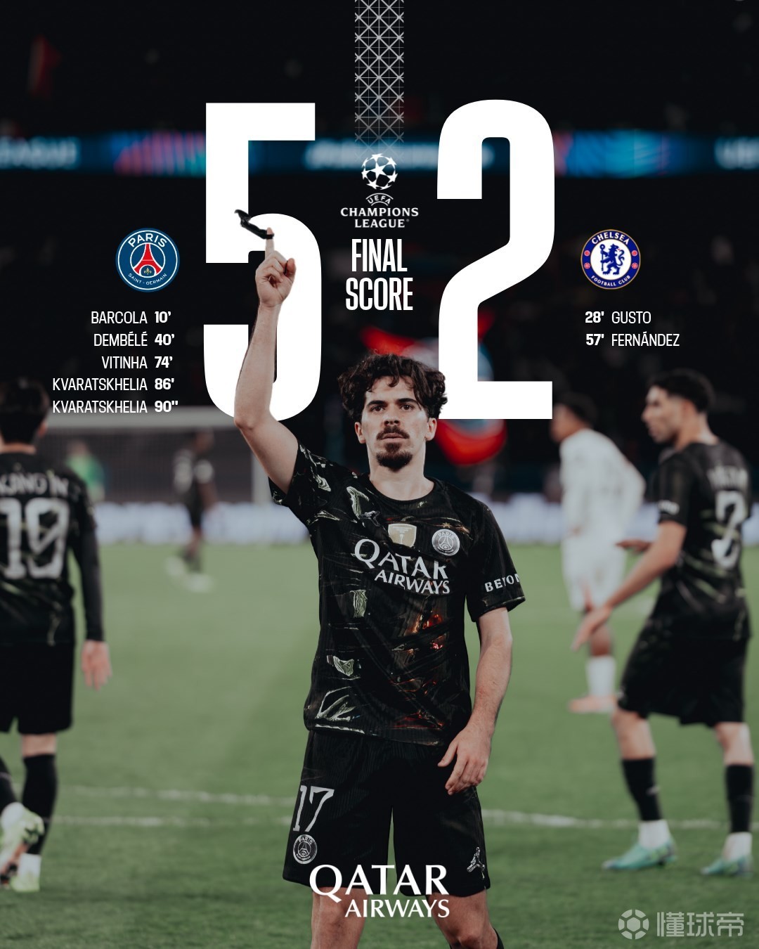 “当比分2-2时,我们以为切尔西会满足于此,巴黎也没有力气再进一步,但一支球队离不开替补席,离不开换人调整。当替补席上有克瓦拉茨赫利亚这样的球员,他带着怒火登场,凭借天赋打入一记世界级进球……这就是勇气与个人天赋的结合。还有登贝莱在反击中那记不可思议的假动作、维蒂尼亚的精彩终结、克瓦拉茨赫利亚那记完美的弧线球。不要忘了,巴黎拥有登贝莱、克瓦拉茨赫利亚和维蒂尼亚这样的顶级球员,虽然我们见过他们状态更好的时候,但今晚他们在关键时刻完成了进球。”