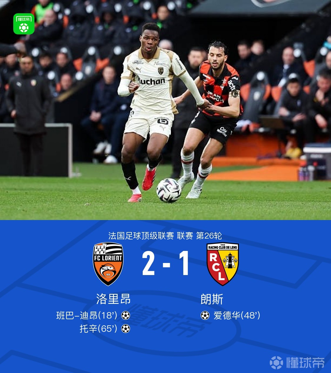 北京时间3月15日法国足球顶级联赛第26轮,洛里昂主场对阵朗斯。上半场班巴-迪昂首开记录。下半场爱德华破门扳平比分,托辛破门将比分超出。最终比分洛里昂 2-1 朗斯。