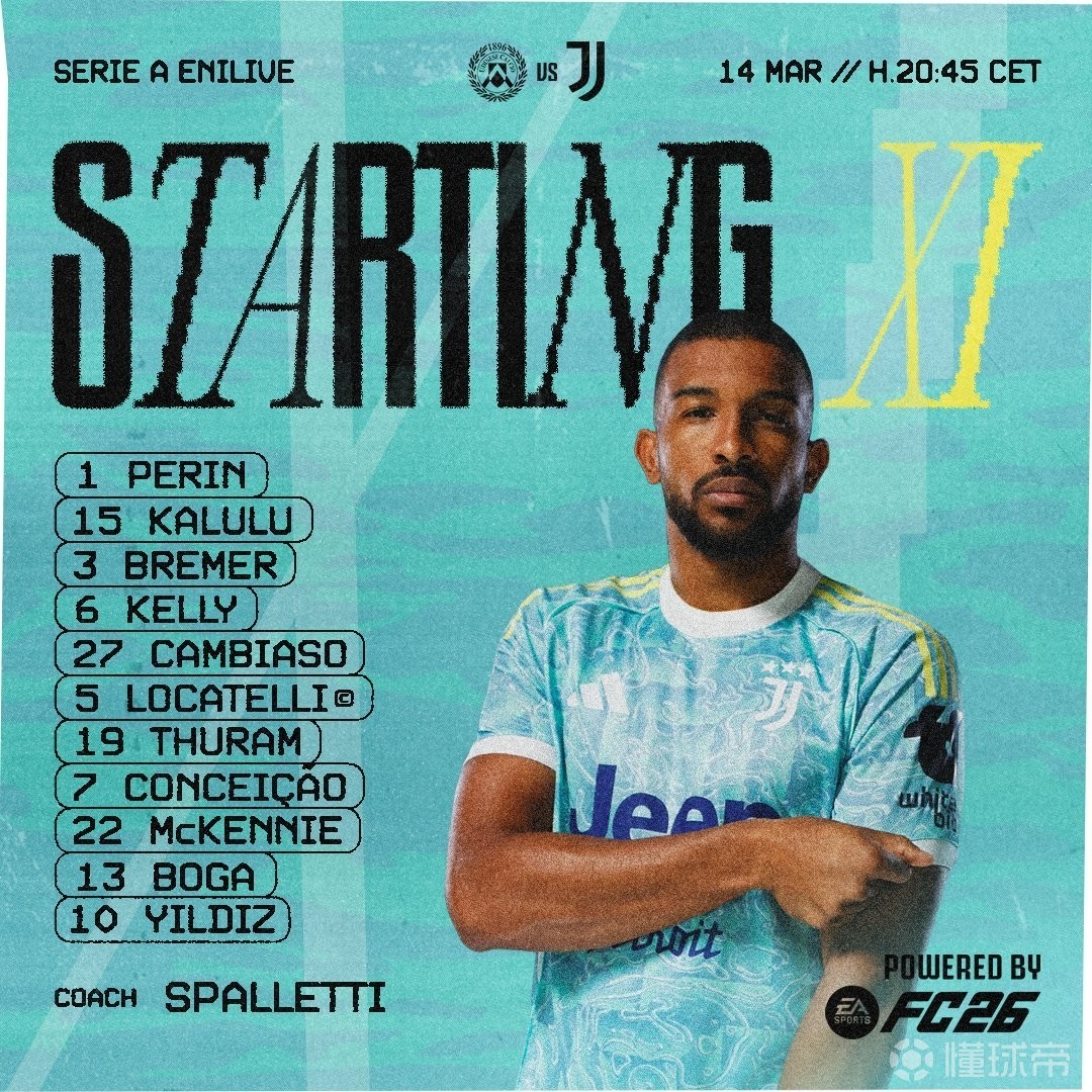 尤文首发:1-佩林、15-卡卢卢、3-布雷默、6-劳埃德-凯利、27-安德烈亚-坎比亚索、5-洛卡特利、19-凯夫伦-图拉姆、7-弗朗西斯科-孔塞桑、22-麦肯尼、13-博加、10-凯南-伊尔迪兹