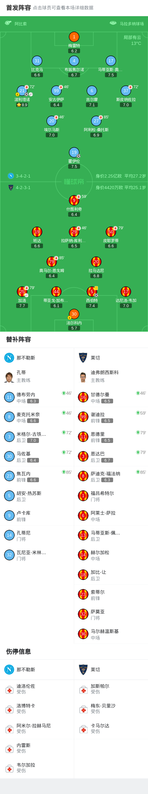 北京时间3月15日意大利足球顶级联赛第29轮,那不勒斯主场对阵莱切。比赛中,莱切球员先由队友助攻完成破门;随后那不勒斯球员波利塔诺助攻霍伊伦打入一球;之后波利塔诺再入一球。最终比分那不勒斯2-1莱切。