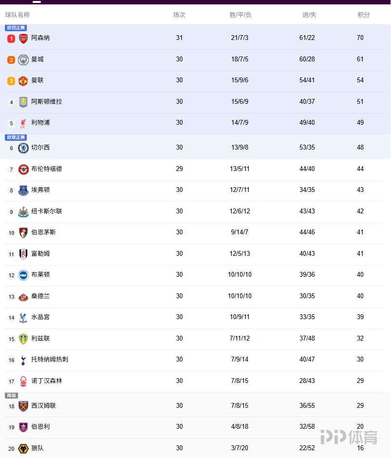 英超联赛进入第30轮,争冠格局逐渐明朗,阿森纳本轮主场2-0战胜埃弗顿,积70分稳居榜首,领先曼城9分,进一步巩固了冠军优势。曼城本轮1-1战平西汉姆联,追赶压力骤增。与此同时,曼联凭借3-1战胜维拉稳固了第三位,目前积54分。