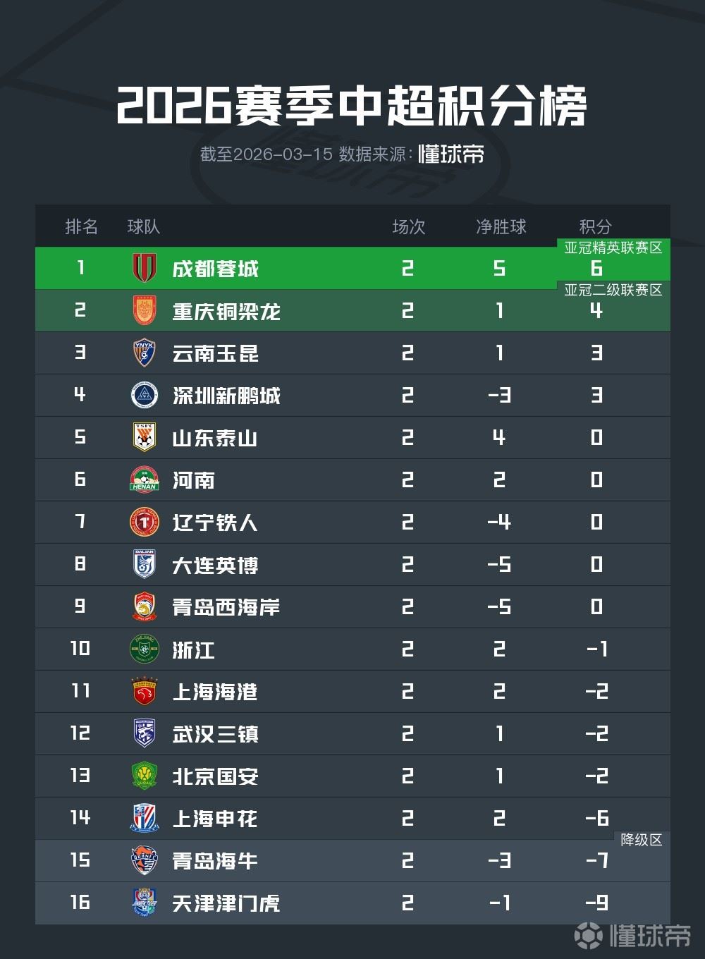 北京时间3月15日,中超第2轮全部战罢。在两支球队负分清零的情况下,积分榜也进一步发生了变化。