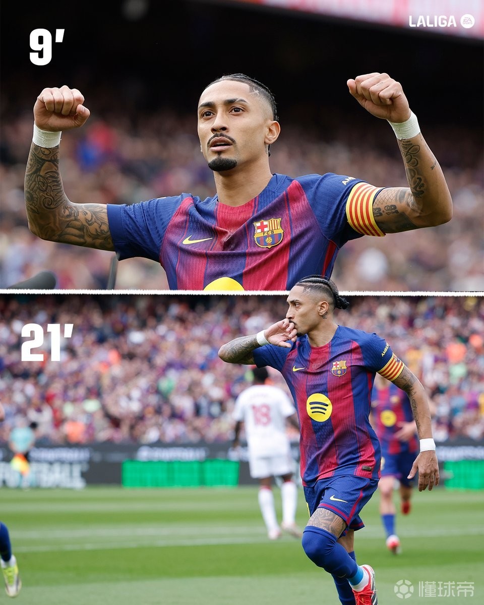 西甲第28轮,巴塞罗那主场对阵塞维利亚,上半场拉菲尼亚通过点球机会打入两球,成为本世纪第六位西甲单场打入两粒点球的巴萨球员。