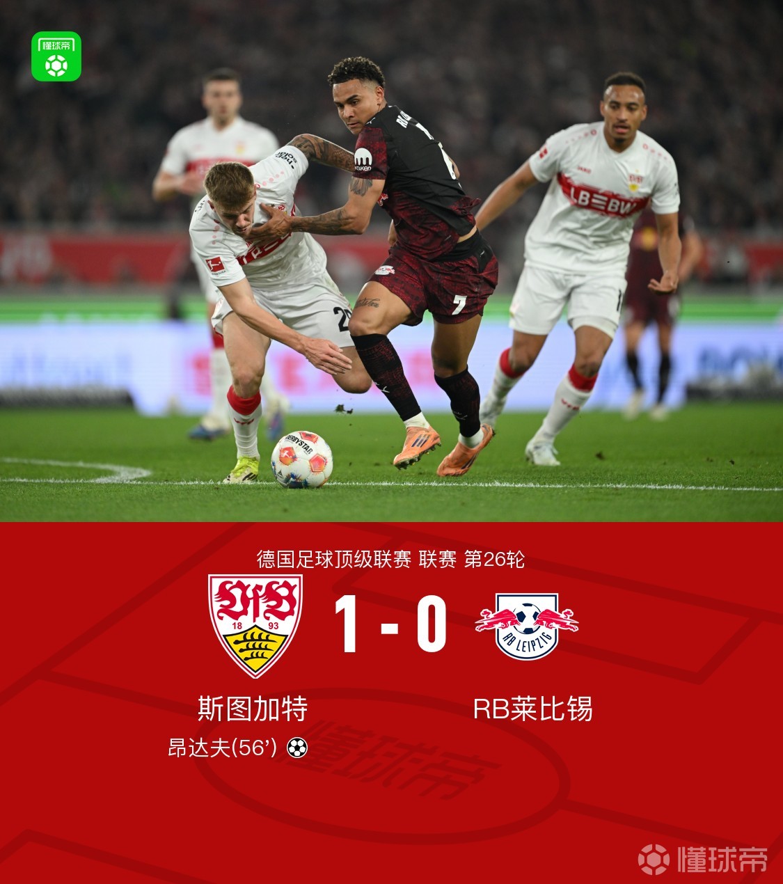 北京时间3月16日德国足球顶级联赛第26轮,斯图加特主场对阵RB莱比锡。下半场昂达夫打入制胜球。最终比分斯图加特 1-0 RB莱比锡。
