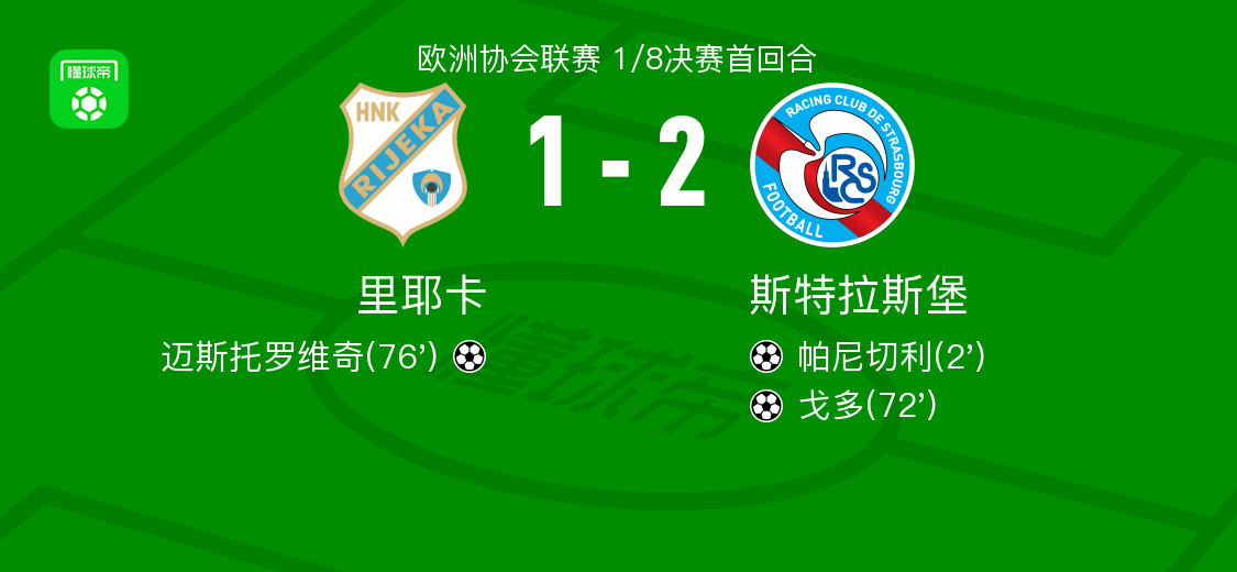 北京时间3月13日欧洲协会联赛 1/8决赛首回合,里耶卡对阵斯特拉斯堡。里耶卡迈斯托罗维奇破门。斯特拉斯堡帕尼切利破门,戈多破门。最终比分里耶卡 1-2 斯特拉斯堡。