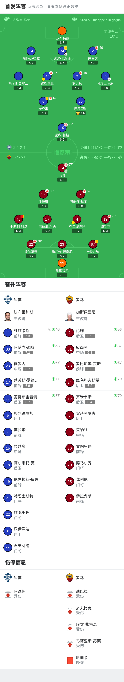 北京时间3月16日意大利足球顶级联赛第29轮,科莫主场对阵罗马。比赛中罗马率先凭借马伦的点球取得进球,随后科莫通过配合由杜维卡斯打入一球扳平比分,之后韦斯利-利马因累计黄牌被罚下,科莫抓住机会由迭戈-卡洛斯再入一球。最终比分科莫2-1罗马。