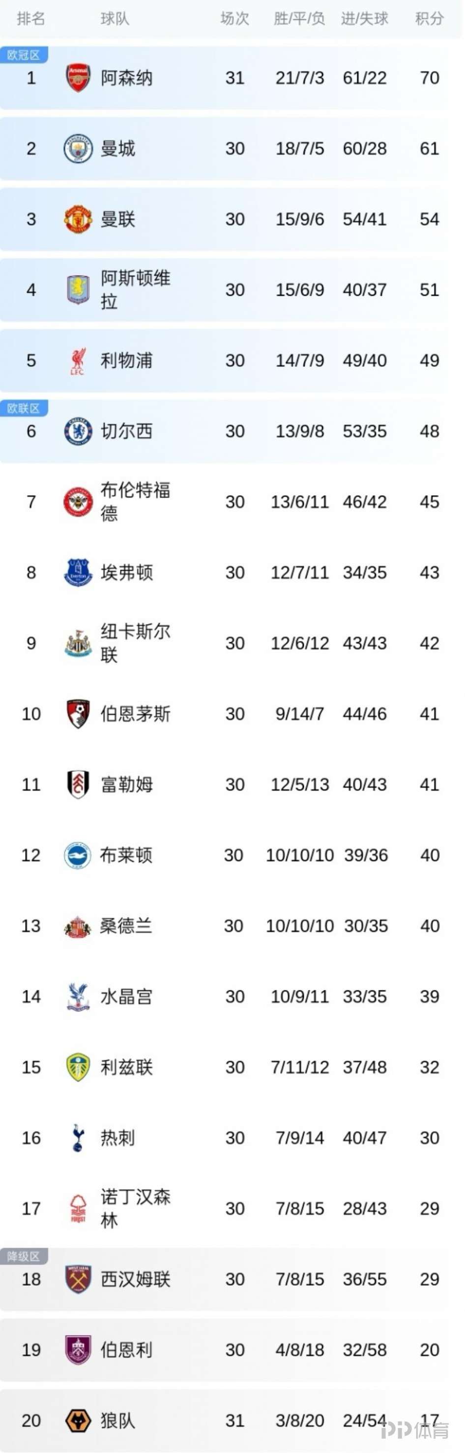 今日英超第30轮最后一场比赛战罢,布伦特福德遭狼队让二追二逼平,距身前的切尔西3分。狼队近3轮2胜1平持续拿分,第14-20名本轮全部踢平。