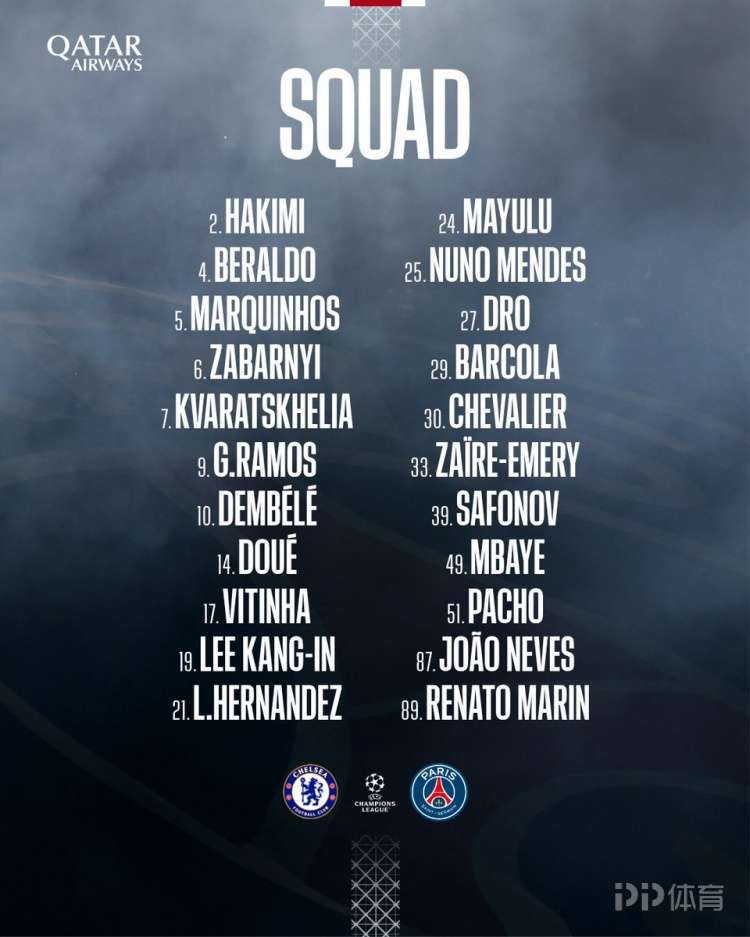 前锋:7-克瓦拉茨赫利亚、9-贡萨洛-拉莫斯、10-登贝莱、14-杜埃、29-巴尔科拉、49-姆巴耶