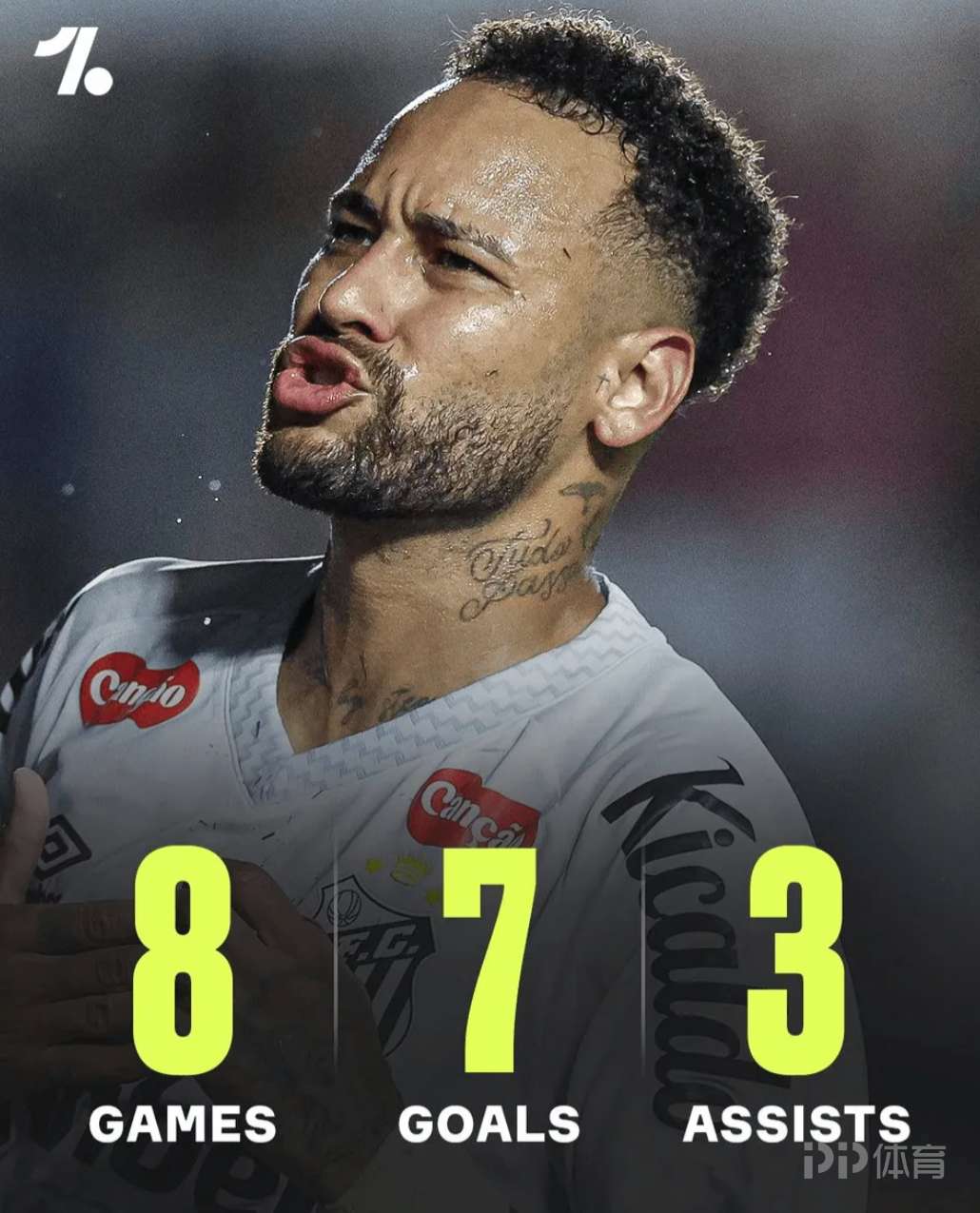 巴西甲级联赛,桑托斯主场1‑1战平来访的科林蒂安,内马尔本场比赛送出关键助攻。数据统计显示,内马尔在最近8场代表桑托斯出战的比赛中7球3助,直接参与了10粒进球。