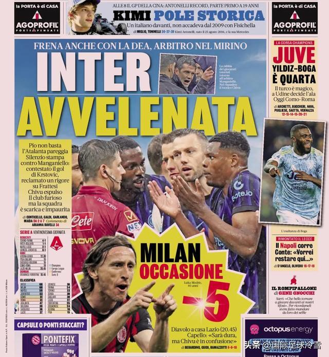 在国米平了亚特兰大时,这些意媒疯狂炒作国米领先优势将缩水,头版头条基本全都有“只差5分”的描述。