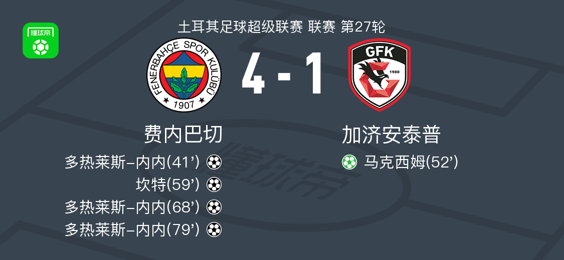 北京时间3月18日土耳其足球超级联赛 联赛 第27轮,费内巴切主场对阵加济安泰普。费内巴切多热莱斯-内内帽子戏法,坎特破门。加济安泰普马克西姆破门。最终比分费内巴切 4-1 加济安泰普。