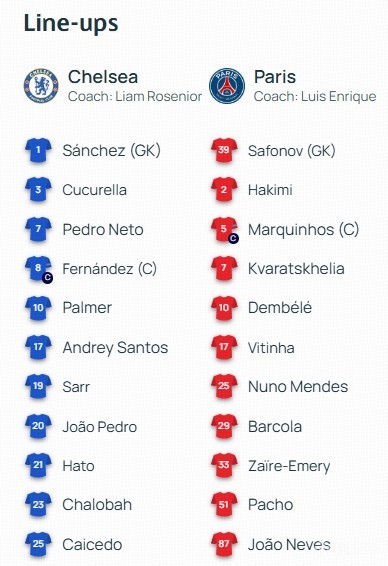 替补:30-舍瓦利耶、89-雷纳托-马林、4-贝拉尔多、6-扎巴尔尼、9-贡萨洛-拉莫斯、14-杜埃、19-李刚仁、21-卢卡斯-埃尔南德斯、24-马尤卢、27-德罗-费尔南德斯、49-姆巴耶