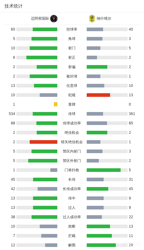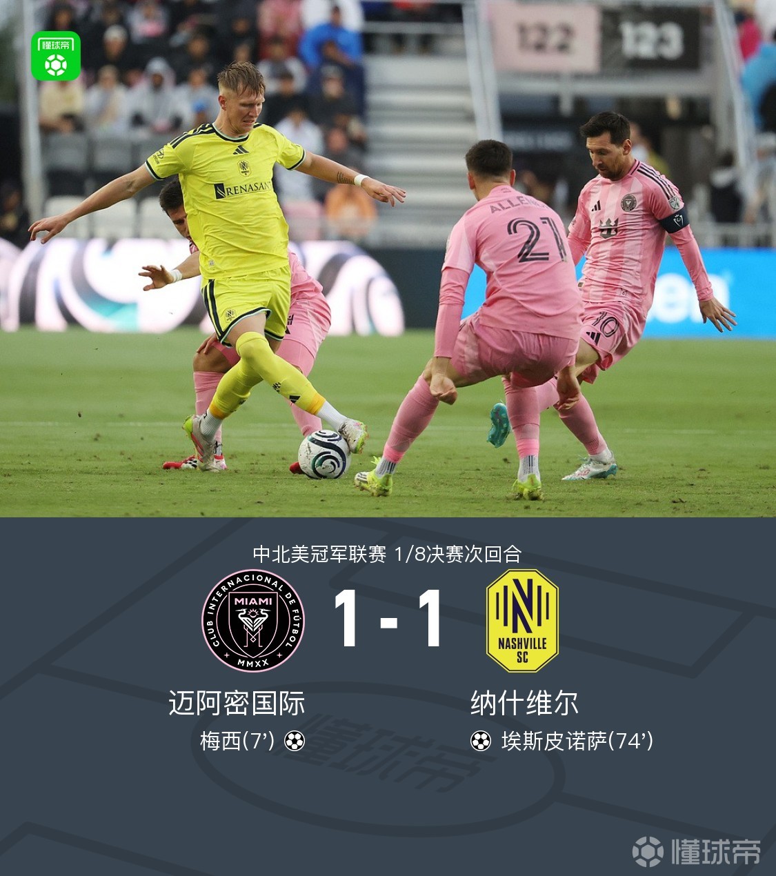 第74分钟,埃斯皮诺萨门前补射破门扳平比分,纳什维尔1-1迈阿密国际