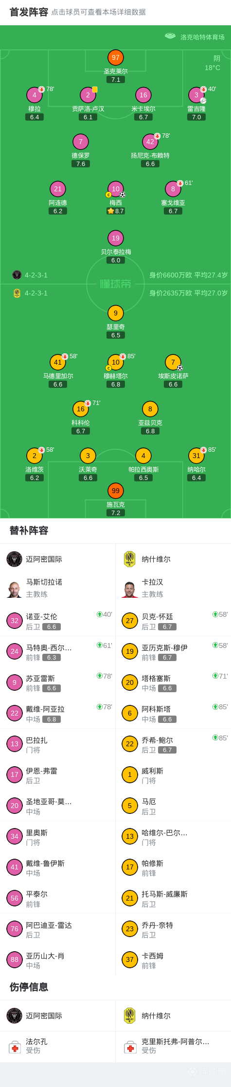 北京时间3月19日中北美冠军联赛 1/8决赛次回合,迈阿密国际对阵纳什维尔。上半场,梅西接雷吉隆横传低射破门,完成职业生涯第900球的里程碑。下半场,埃斯皮诺萨门前补射破门,打进客场进球。最终,纳什维尔1-1迈阿密国际,凭借客场进球晋级八强。