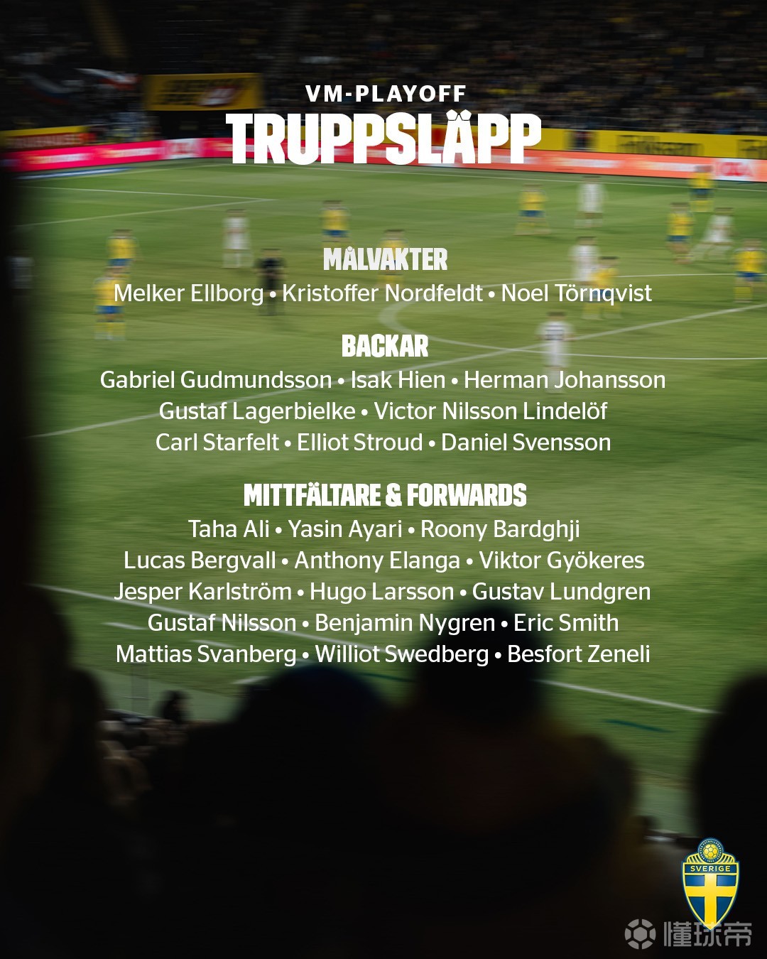3月18日,瑞典队公布了新一期国家队的集训名单,以备战3月27日的世界杯预选赛欧洲区附加赛。阿森纳球星哲凯赖什领衔进攻线,巴尔德吉、贝里瓦尔、埃兰加等球员悉数入选,利物浦球星伊萨克则因伤缺席了这次集训。