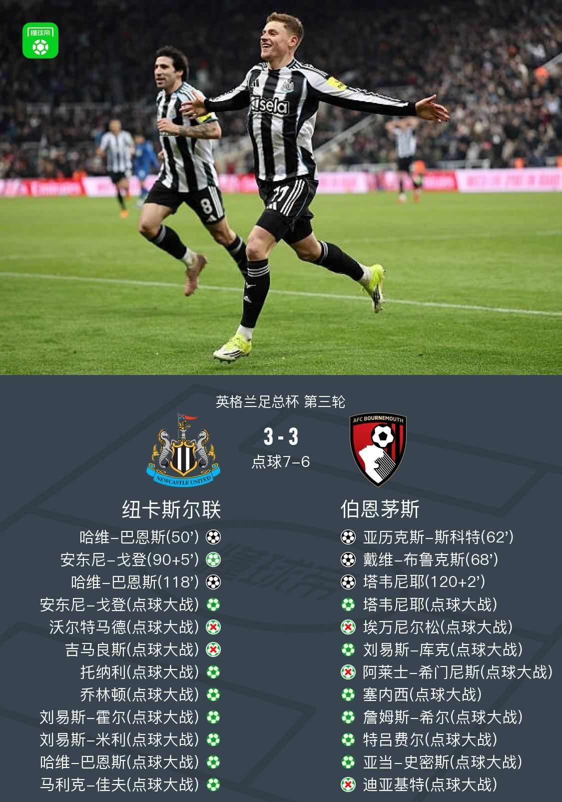 北京时间1月10日英格兰足总杯第三轮,纽卡斯尔联对阵伯恩茅斯。双方比赛过程跌宕起伏。哈维-巴恩斯先拔头筹,斯科特扳平比分,布鲁克斯远射反超,下半场伤停补时最后阶段,戈登点射破门将比赛拖入加时。加时赛最后时刻,哈维-巴恩斯头球破门,但塔韦尼耶迅速绝平,比赛进入点球大战。点球大战中,沃尔特马德和吉马良斯接连失点一度使得纽卡岌岌可危,但拉姆斯代尔的神勇扑救力挽狂澜,双方进行了9轮点球大战,最后佳夫打进,迪亚基特罚丢。纽卡点球大战7-6,总比分10-9淘汰伯恩茅斯晋级足总杯下一轮。