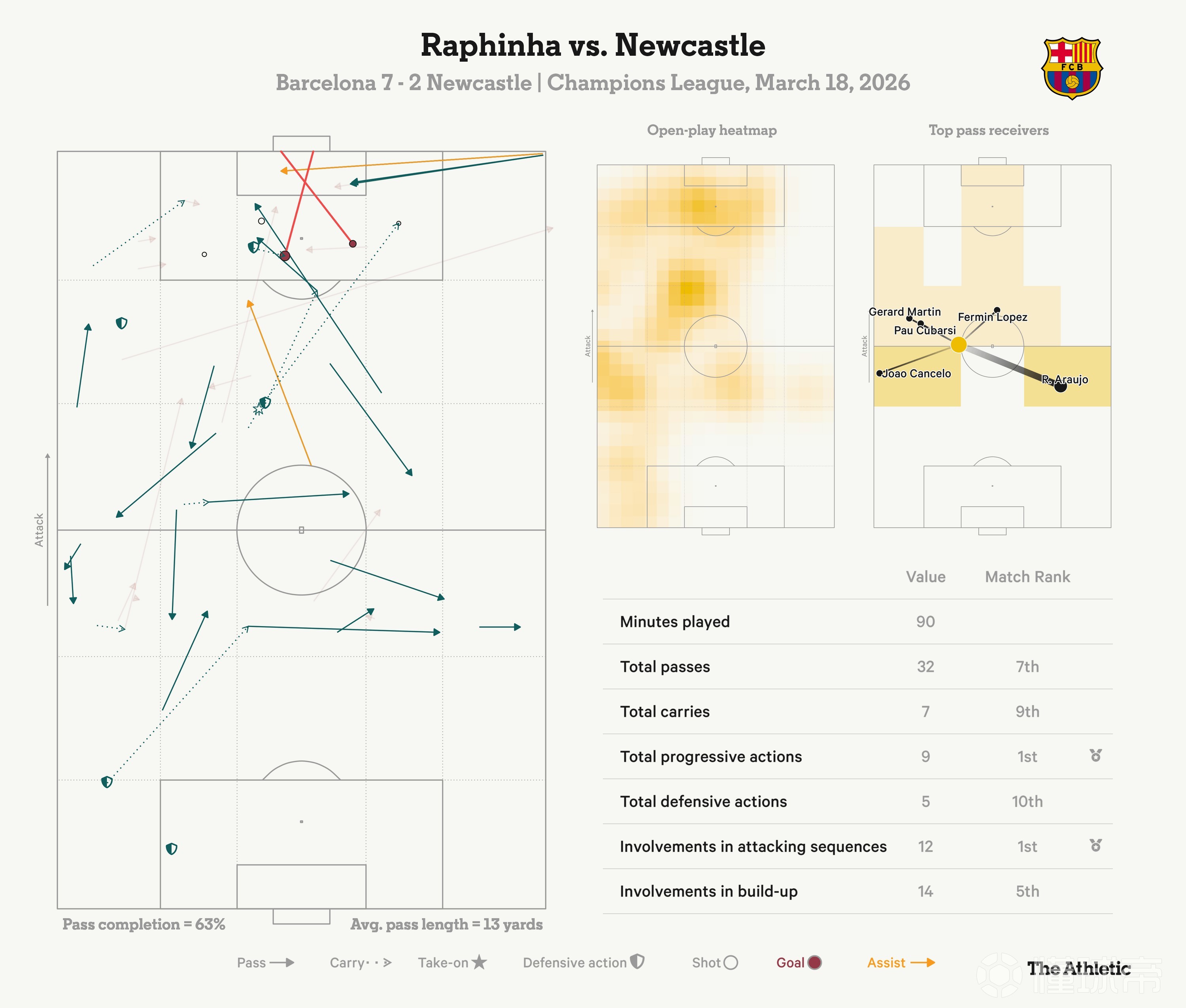 在这场混乱的比赛中,拉菲尼亚频繁参与其中,屡次给纽卡制造麻烦(如下方的球员数据图所示)。正是他的任意球传中——得益于纽卡的防守——帮助伯纳尔为巴萨取得2-1领先。