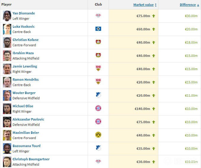 1、扬-迪奥曼德(莱比锡) 上涨3000万欧至7500万欧