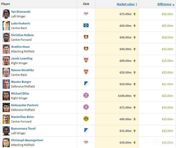 德甲球员身价涨幅榜TOP10:
